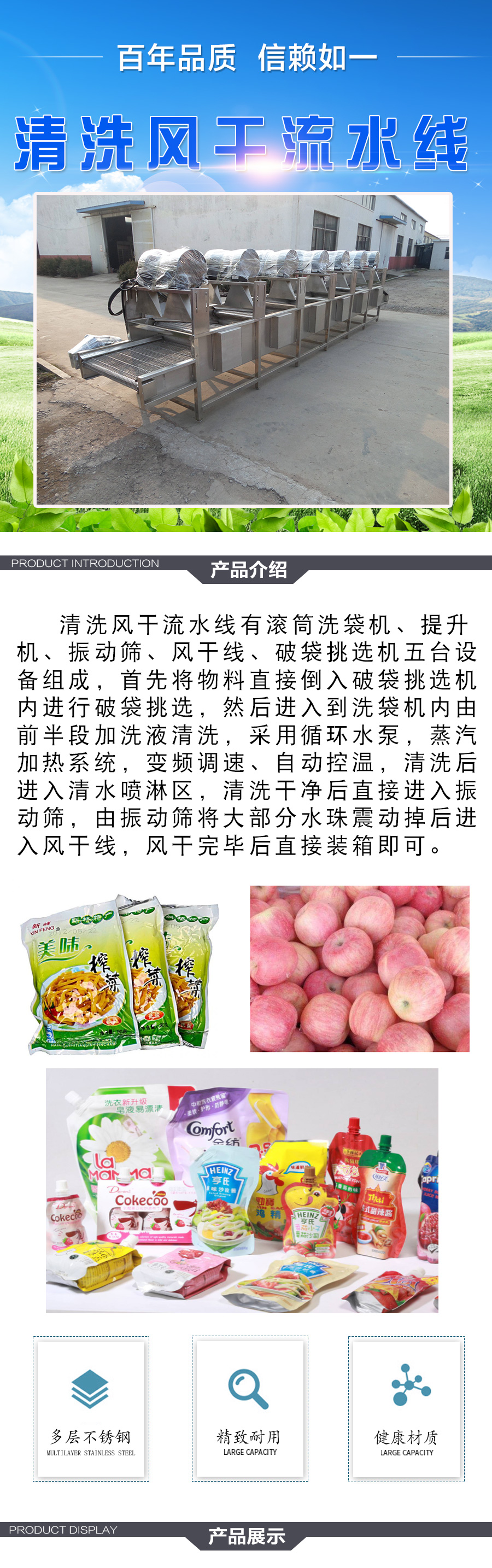 清洗风干流水线有滚筒洗袋机、提升机、振动筛、风干线、破袋挑选机五台设备组成,首先将物料直接倒入破袋挑选机内进行破袋挑选,然后进入到洗袋机内由前半段加洗液清洗,采用循环水泵,蒸汽加热系统,变频调速、自动控温,清洗后进入清水喷淋区,清洗干净后直接进入振动筛,由振动筛将大部分水珠震动掉后进入风干线,风干完毕后直接装箱即可。下面介绍一下具体步骤: