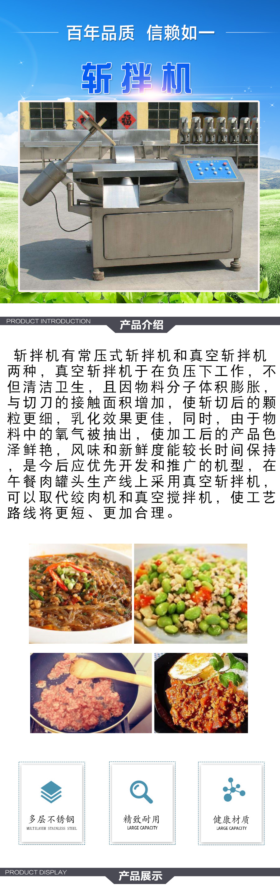 2、斩拌机有常压式斩拌机和真空斩拌机两种,真空斩拌机于在负压下工作,不但清洁卫生,且因物料分子体积膨胀,与切刀的接触面积增加,使斩切后的颗粒更细,乳化效果更佳,同时,由于物料中的氧气被抽出,使加工后的产品色泽鲜艳,风味和新鲜度能较长时间保持,是今后应优先开发和推广的机型,在午餐肉罐头生产线上采用真空斩拌机,可以取代绞肉机和真空搅拌机,使工艺路线将更短、更加合理。