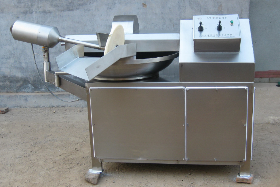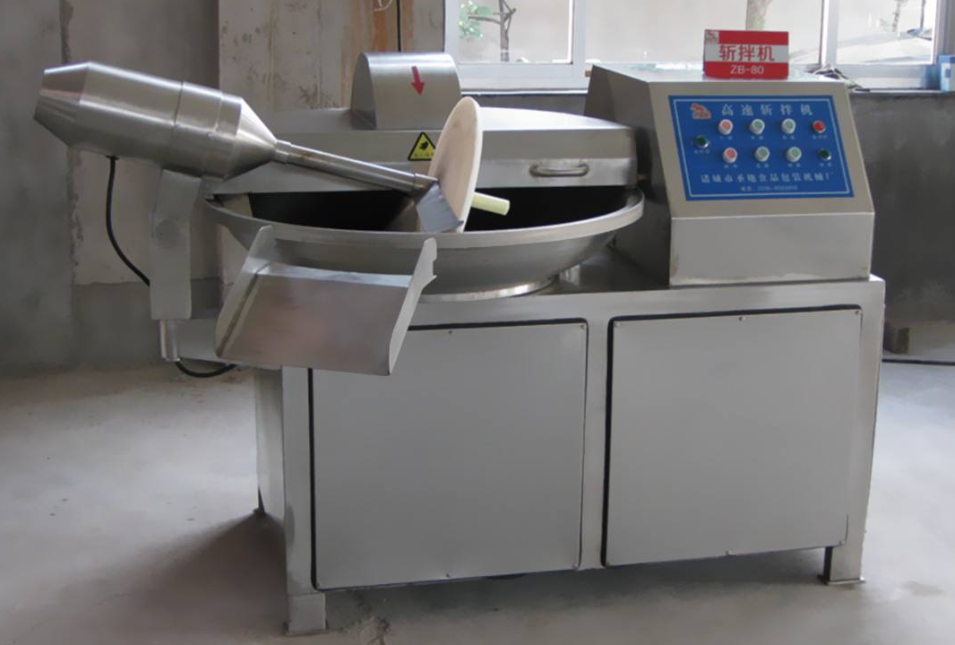 1、斩拌机是生产肉糜类产品(粉肠、西式香肠、午餐肉)的关键设备,经去皮、去骨整选的肉块,倒入慢速回转的斩肉盘内,斩拌轴(其上一般安装2~6把刀片)在斩肉盘内高速旋转,对物料进行切削,将肉块斩切成肉糜,并可与配料一起斩拌。斩拌机是一种兼具斩拌、搅拌、乳化等多功能的机械;